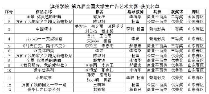 近日,第九届全国大学生广告艺术大赛全国总决赛获奖结果揭晓。我校艺术学院学生共获得国家二等奖1项、优秀奖1项;山东赛区二等奖1项、三等奖3项、优秀奖7项。