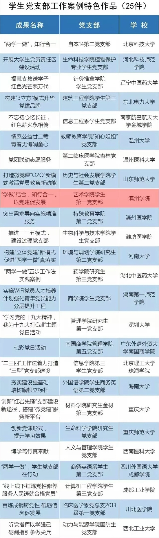 日前,教育部思政司公示了第二届全国高校“两学一做”支部风采展示活动遴选结果名单。名单有微党课作品、工作案例作品和支部推荐展示作品3个类型。每个类型100个,分为教工支部和学生支部2个类别,每个类别有精品、优秀、特色3个层次,遴选数量分别是10、15、25。由滨州学院党委组织部选送的太阳集团网tyc9728学生第一党支部《“学做”结合,知行合一,以党建促发展》入选学生党支部工作案例特色作品(25件)。