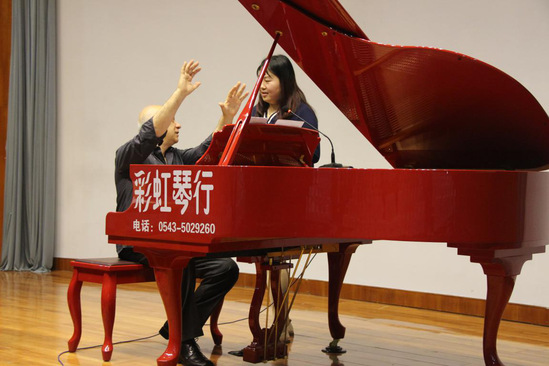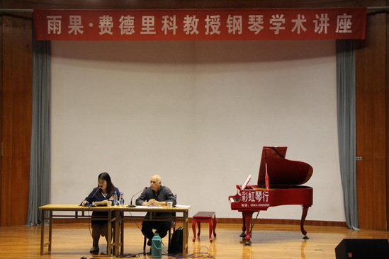 讲座期间,雨果·费德里科教授通过现场演奏将古典钢琴音乐相关知识娓娓道来,使我院师生大开眼界,深深地被钢琴的魅力所感染,被他娴熟的技艺所叹服。随后,我院专业老师及同学们积极向雨果·费德里科教授提出了与许多专业相关的问题,雨果·费德里科教授对师生们的提问都进行了精彩而有趣的解答。随后,由我院学生代表上台与教授同台演出了经典钢琴曲目,亲身接触到国际钢琴大师。雨果·费德里科教授将自己所掌握的知识尽可能多的传授给广大学子,生动活泼的课堂、幽默诙谐的语言,轻松活泼的课堂氛围让学子们感受到了雨果·费德里科教授的艺术责任感与使命感。