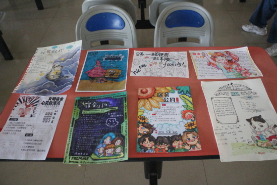 每个宿舍制作专属的宿舍公约,宿舍公约种类多种多样,并且进行多元化、新颖化、个性化设计。内容合理,条理清晰,积极向上,文明健康,促进学习。宿舍是大学生学习、生活的主要阵地,起到模范和约束的作用,是建立和谐人际关系的基础,良好的宿舍文明氛围是大学生学习、生活的重要保障。公约内容丰富多彩主要包括,作息时间、卫生安排、学习安排、寝室团建、特色文化等。加强了同学们之间的友谊,巩固了宿舍的良好关系。