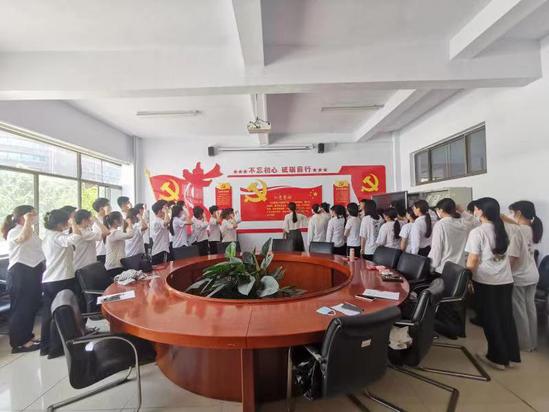 最后,在学生党支部书记的带领下,全体党员起立,举起右手、握紧拳头,庄严宣誓。毕业生重温入党誓词,表达了对坚定政治信念和时刻不忘初心、矢志永远奋斗的坚定决心。