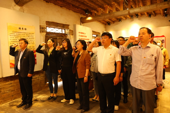 在讲解员的引领下,大家认真聆听、仔细观看。听着一句句讲解,看着一幅幅生动的图片、一件件真实的物品……山东渤海军区教导旅无私奉献、浴血奋斗的情景鲜活地再现眼前,大家仿佛置身于那段党的流年岁月中感受时代变迁,感受革命烽火带给革命党人的精神洗礼。面对鲜艳的党旗,全体党员重温了入党誓词。