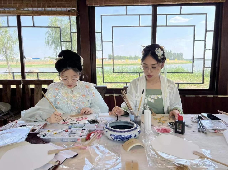 秉承着“传统与新潮互动,文化与快乐碰撞”的主旨,我院师生确定了以传统舞蹈、扇面绘画为载体的特色主题文化宣传活动。将人们喜闻乐见的舞蹈与绘画与三河湖镇本地文化特色结合起来,在一阵阵优美的音乐中,我院舞蹈专业的学生身着汉服,在三河湖镇美丽的风景下翩翩起舞,河畔边、木桥上、小路旁都有她们跳动的身姿,随风飘扬的裙摆拨散了夏日的炎阳,给三河湖镇带去了一抹青春靓丽的风采,使市民群众更加关注乡村发展,传承传统文化,也使得人们对三河湖镇有了更全面的了解,吸引更多市民,助推乡村旅游发展。