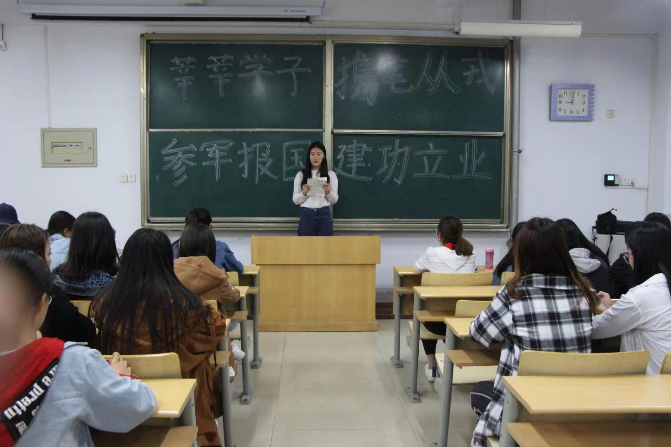 班会上,班主任首先讲解了大学生参军入伍的意义、大学生应征入伍流程等内容,随后重点讲解了大学生应征入伍的相关优惠政策,最后学生代表现场上台发言,分享了学生对于参军的看法和心得。