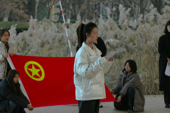 仪式第四项,张明月同学带领全体新团员庄严宣誓:我志愿加入中国共产主义青年团,坚决拥护中国共产党的领导,遵守团的章程,执行团的决议,履行团员义务,严守团的纪律,勤奋学习,积极工作,吃苦在前,享受在后,为共产主义事业而奋斗。团员同学将右拳举过肩,面对团旗庄严宣誓,目光坚定。