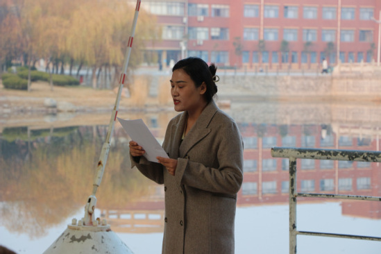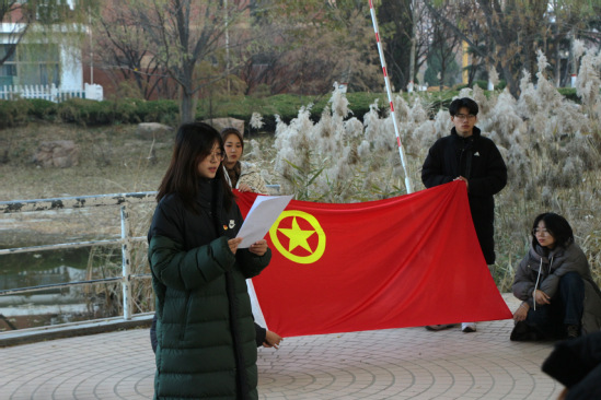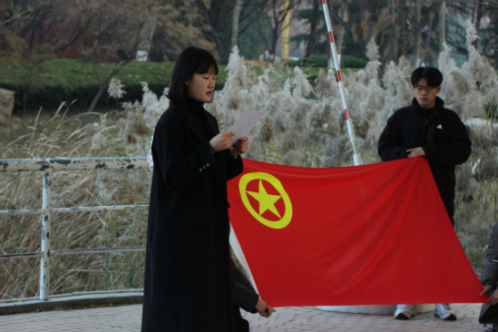 仪式第五项,张明月同学带领新团宣宣读《团章》,学习团的组织章程和行为规范。并代表老团员进行讲话,她倡导全体新团员为新时代的强国建设、民族复兴伟业团结奋斗。