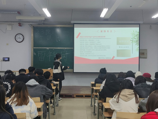 各班团支书带领同学们深入学习了奋斗精神的内涵与价值,明确了奋斗精神在新时代的重要性,并与个人成长相结合,学习锤炼奋斗精神的方法和途径。接着讲解了雷锋精神的内涵和意义,号召同学们向雷锋同志学习,坚持人民至上,坚持自信自立,同学们在雷锋精神的指引下,唱响雷锋歌曲、讲述雷锋故事、寻找身边“雷锋”,以雷锋同志为榜样,在日常生活中积极弘扬雷锋精神,将雷锋精神落到实处,争做新时代的雷锋接班人。