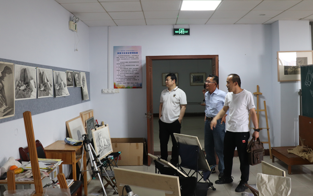 我院教师首先参观滨州市第一中学美术学科基地教学环境和教育教研基础设施。在参观过程中,我院教师对基地在专业设置、学生培养、特色活动、美育课程开发等方面做的工作进行交流,并就“美育一体化”在基层中小学的实施路径、高校教研资源如何向基层教育进行有效渗透等问题与一中领导及美术教研组的老师们展开深入讨论。