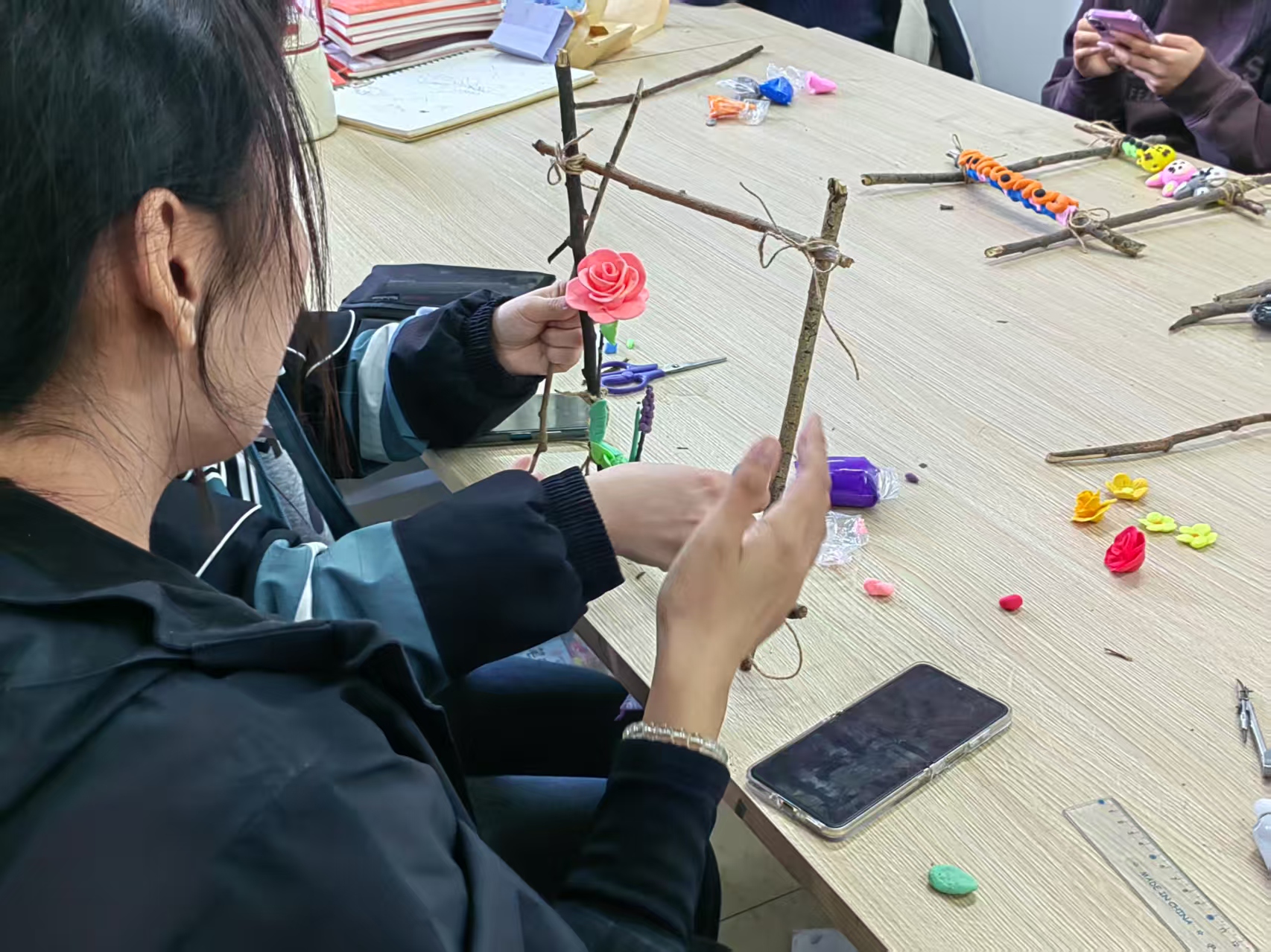 活动以环保无毒的彩泥为核心材料,其柔软质地与超轻黏土的易塑特性深受喜爱,兼顾色彩丰富性与作品持久性。参与者依托自然形态的树枝为载体,经工作人员提前清理打磨后,将彩泥与树枝巧妙结合,赋予创作更多可能性。制作过程中,通过使用剪刀、镊子等工具培养学生的专注力,每一步操作均促进内心平静与成就感积累,最终实现压力释放与自我表达的双重目标。