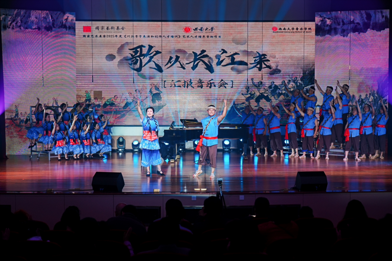11月15日晚,国家艺术基金2025年度艺术人才培养资助项目“川江号子表演和创作人才培训”结项汇报演出——“歌从长江来”音乐会在西南大学上演。我院王贝老师受邀担任该项目结项音乐会多首作品的领唱与主演。